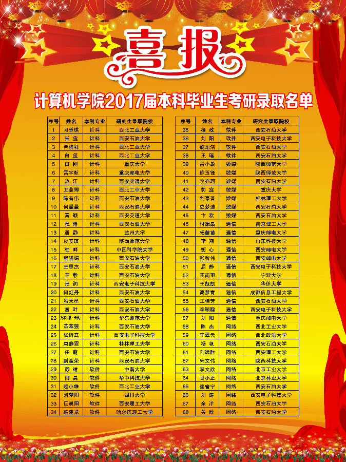2017届本科毕业生考研工作传来捷报。共有80名同学考研上线,占毕业生总数22.5%,68名同学考研成功,考研录取率为19.1%,创棋牌游戏平台