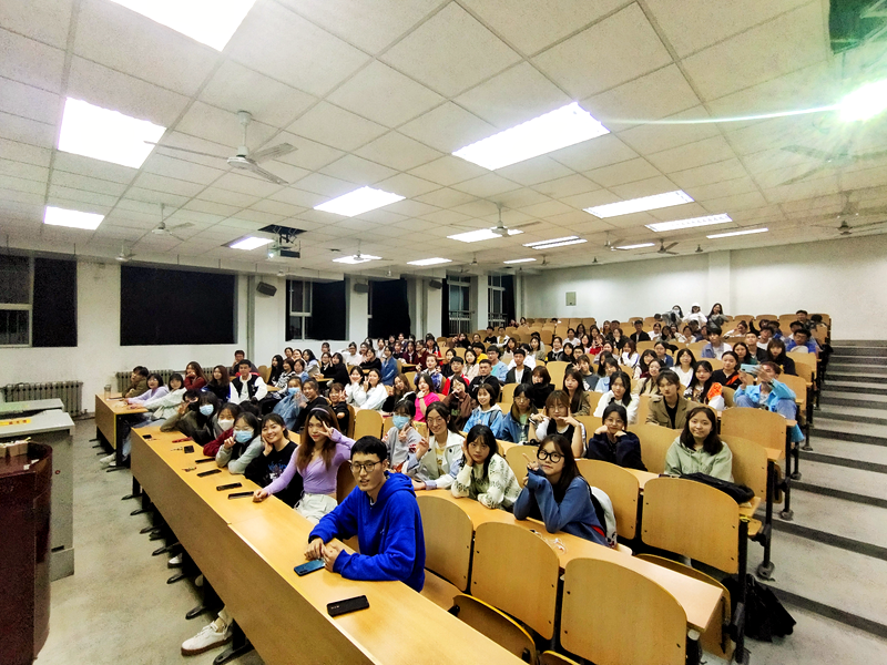 社团指导老师王天航,会长何文静,副会长李雨奇、赵靖桦、陈梓杨,各部门负责人以及100余名2021级新生参加会议。