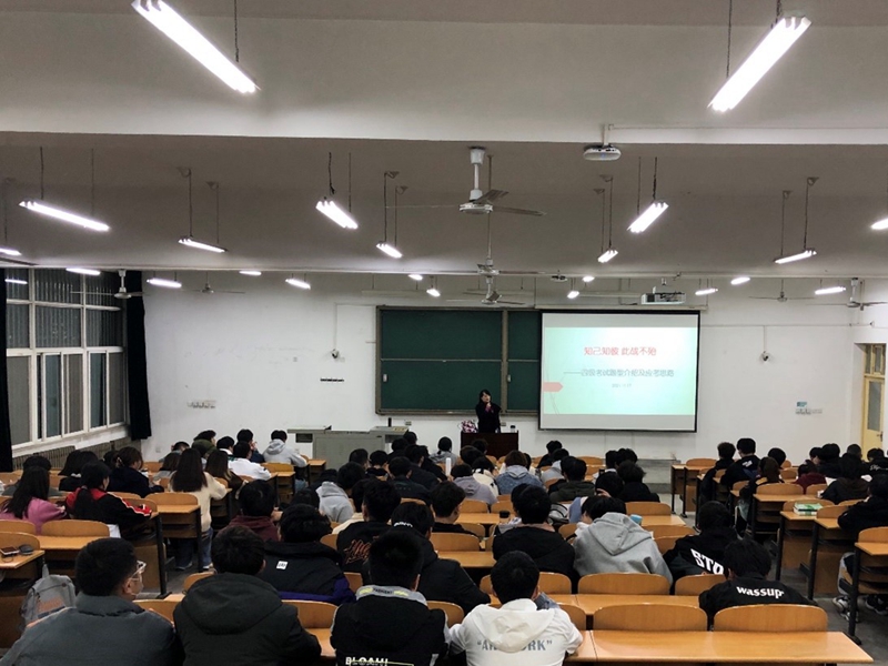 毕莹老师以“知己知彼,此战不殆——四级考试题型介绍及应考思路”为题,分别从考试流程、注意事项、写作翻译、应试技巧、重点语法等五个方面对CET-4考试作了介绍,系统地分析了四级考试流程及注意事项,全面总结了四级考试题型以及应答技巧,让学生对于CET-4考试有了一个基础性的认识。