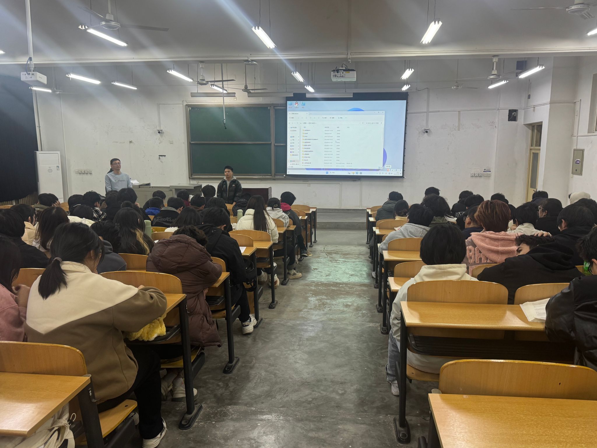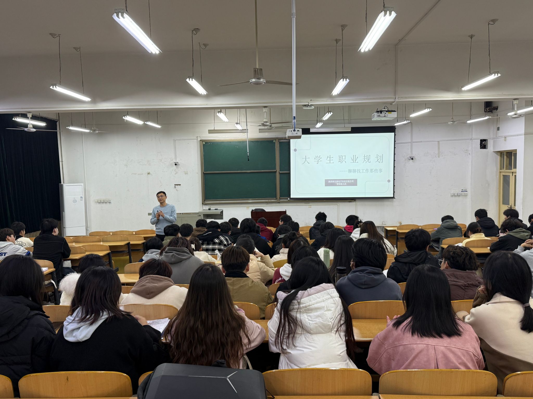 在鄠邑校区博思楼B125教室召开2022级本科生职业规划指导讲座。陕西海尔森电子科技有限公司郭瑞老师担任主讲,2022级本科生约120人参加大会,会议由2022级辅导员姚谦主持。