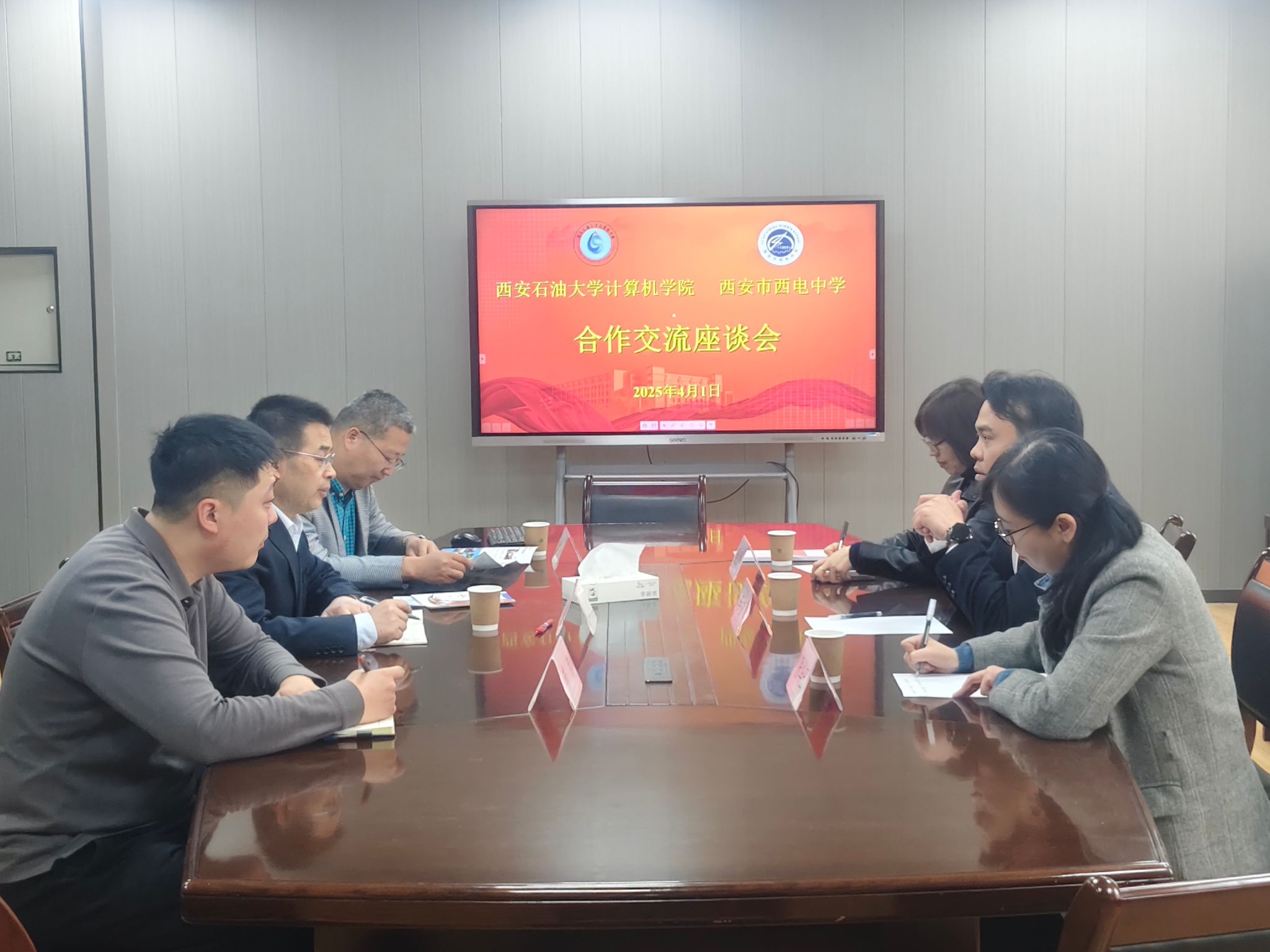 党委书记庞秉谦、教学副院长杨文阳、办公室主任李路,西安市西电中学校长李智飞、副校长张华玉、办公室主任董娅婷参加了交流座谈会。
