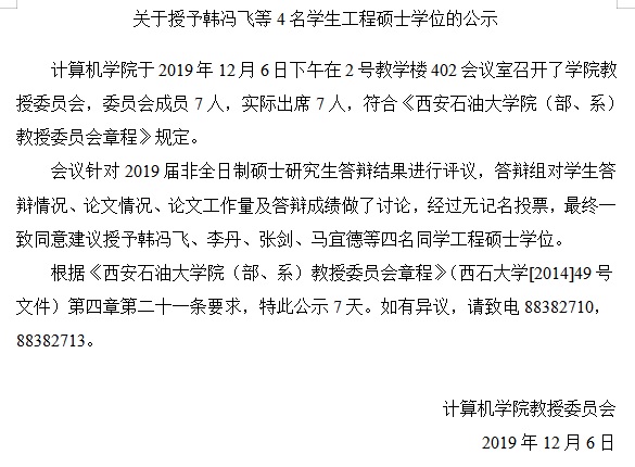 关于授予韩冯飞等4名学生工程硕士学位的公示