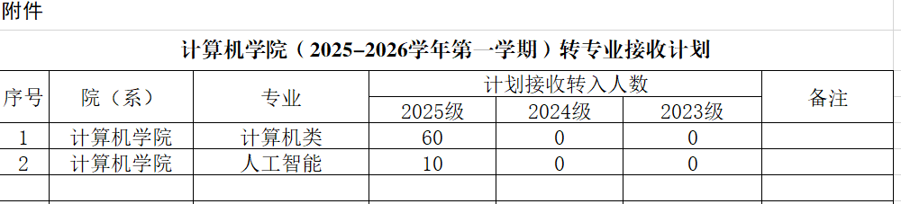 2025-2026学年第一学期拟计划接收2025级转入学生70人。其中,计算机类60人,人工智能专业10人。2023级、2024级各专业暂无接收转入学生计划。