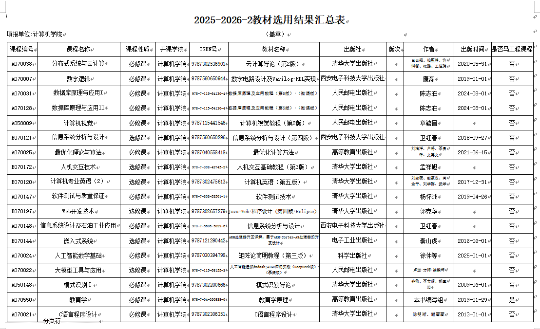 根据《关于启用超星教材管理系统及征订2026年春季教材的通知》,经棋牌游戏平台 教材建设工作领导小组审议通过,现将2026年春季学期教材选用结果公示如下:公示期:2026年1月9日-1月12日。