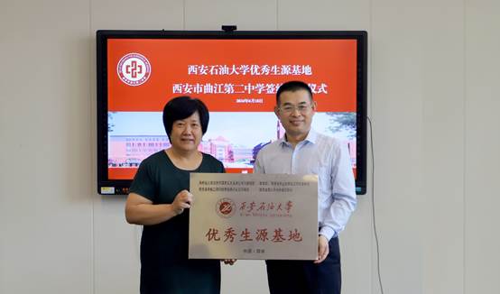 庞秉谦书记与朱琳瑛校长签署了西安石油大学优秀生源基地建设协议,并授予“优秀生源基地”牌匾。